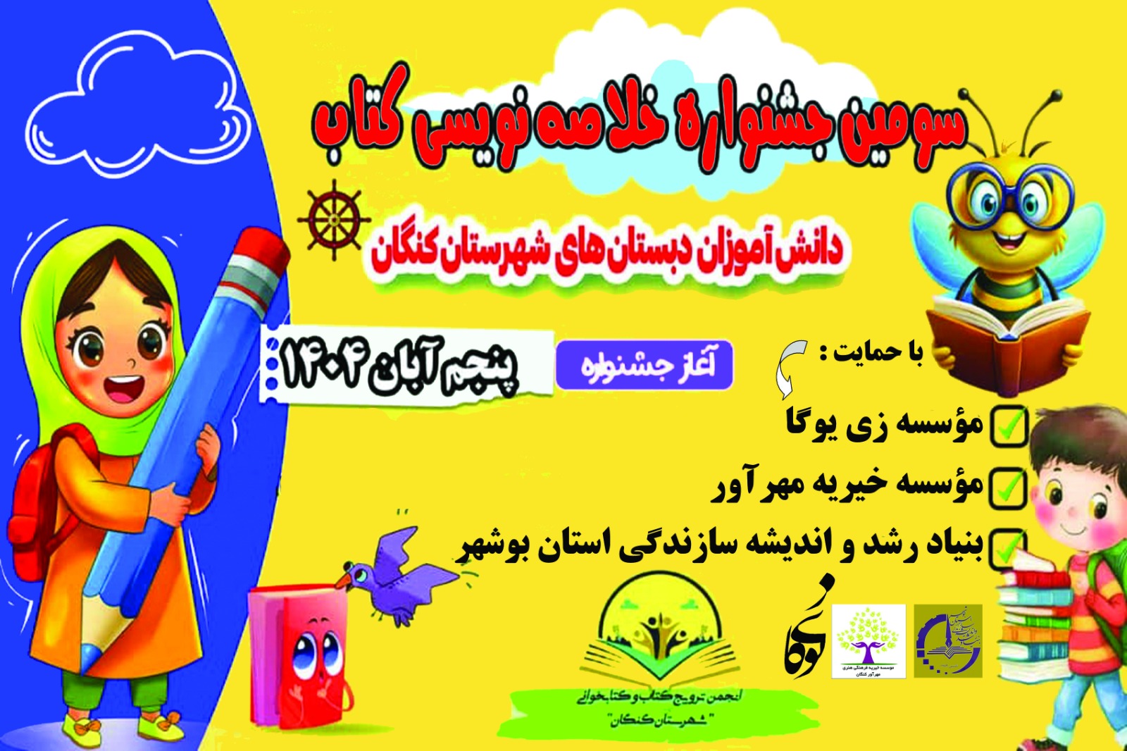 جشنواره خلاصه نویسی کتاب دانش آموزان دبستانهای شهرستان کنگان(بیش از 50 مدرسه) از هفته اول آبان ماه آغاز شده و همچنان ادامه دارد.